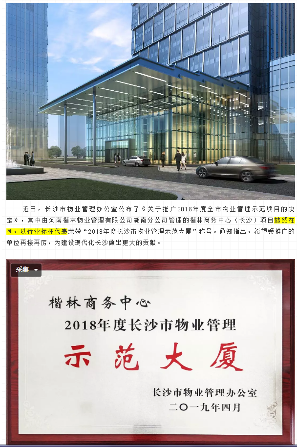 長沙楷林商務中心獲“長沙市物業(yè)管理示范大廈”稱號