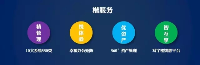 精管理——建筑精細(xì)化管理系統(tǒng),楷林物業(yè)將對(duì)建筑的管理分為十大類330項(xiàng),致力于不斷精細(xì)化對(duì)物的管理,全面保障建筑安全穩(wěn)定運(yùn)行;悅體驗(yàn)——愉悅辦公體驗(yàn)系統(tǒng),楷林物業(yè)圍繞用戶多元化的需求,從美食、人文、運(yùn)動(dòng)、綠色、讀書(shū)、藝術(shù)、興趣、活動(dòng)、交流等多維度全方位構(gòu)筑幸福辦公矩陣;優(yōu)資產(chǎn)——資產(chǎn)創(chuàng)新運(yùn)營(yíng)系統(tǒng),通過(guò)楷林360°資產(chǎn)管理,使客戶資產(chǎn)在市場(chǎng)中獲得收益最大化,整合挖掘各種資源,開(kāi)展創(chuàng)新的深層次服務(wù),給客戶和企業(yè)創(chuàng)造更多價(jià)值;智互享——智慧平臺(tái)互享系統(tǒng),通過(guò)新技術(shù)、新觀念、新資源、新服務(wù)的集成,打通人、企業(yè)與資源之間的鏈接與共享,使物業(yè)管理與服務(wù)系統(tǒng)互聯(lián)化、物聯(lián)化、智能化。
