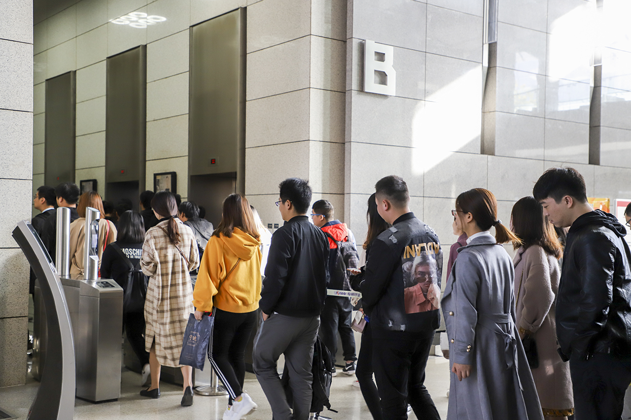 A、B座電梯廳內(nèi)各有一名客服助理為客戶控梯并輔助指引排隊(duì)。