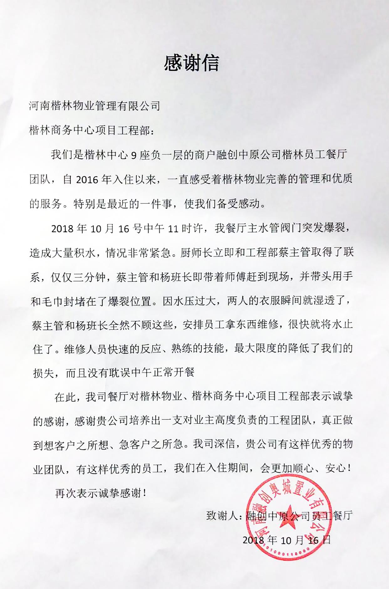 “楷林物業(yè)有這樣優(yōu)秀的工程團(tuán)隊(duì),為我們提供服務(wù),讓我們的工作更加順心、安心了。”10月16日下午,融創(chuàng)中原客戶帶著“感謝信”專程來到楷林中心南區(qū)物業(yè)服務(wù)中心辦公室,對工程部主管蔡亞文、領(lǐng)班楊志銘以及其他工程部同事表達(dá)誠摯的感謝。