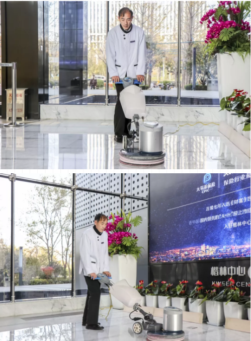 “清理時(shí)間一定要把控好。時(shí)間長(zhǎng)了,容易花;時(shí)間短了,亮度會(huì)不夠;所以我一般把時(shí)間控制在7—10分鐘。而且必須采用從前至后,從左到右的移動(dòng)順序按部就班地一塊一塊的進(jìn)行處理……”現(xiàn)如今,在郭師傅的眼里,每月一次的石材結(jié)晶養(yǎng)護(hù)已經(jīng)手到擒來。從事養(yǎng)護(hù)工作四、五年的郭師傅知道,石材結(jié)晶養(yǎng)護(hù)是非常耗時(shí)耗力,加之機(jī)器難以掌握,稍有不慎,便會(huì)碰壞周邊的物品或傷害自己,可謂是對(duì)技術(shù)要求甚高的工種。而郭師傅日復(fù)一日的堅(jiān)持這項(xiàng)工作,顯然已經(jīng)摸清了其中的“門道”。