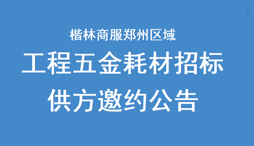 楷林商服鄭州區(qū)域五金耗材配送招標供方邀約我公司擬就鄭州區(qū)域各項目五金材料配送招標進行邀請報名,茲邀請鄭州區(qū)域相關(guān)優(yōu)質(zhì)供應商前來報名投標?,F(xiàn)將有關(guān)事項說明如下:一、項目名稱:楷林商務服務集團鄭州區(qū)域五金材料配送招標供方邀約。二、邀約主體:楷林