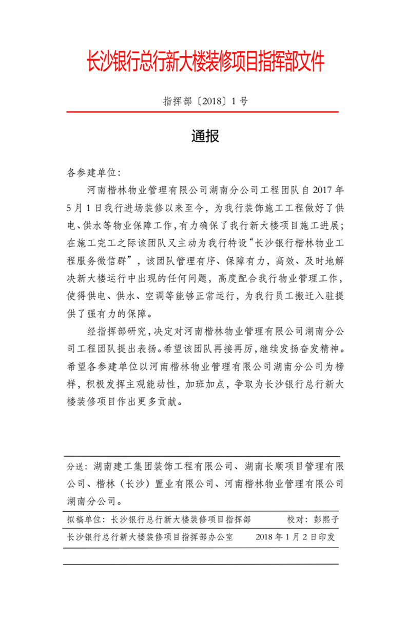 貼心的服務(wù),有力的保障,這一幕幕讓用戶(hù)看在眼里,記在心里。在2018年1月2號(hào),長(zhǎng)沙銀行總行大樓裝修項(xiàng)目指揮部正式發(fā)出他們新年第一個(gè)公文函,對(duì)我們的工程團(tuán)隊(duì)提出了表?yè)P(yáng)。