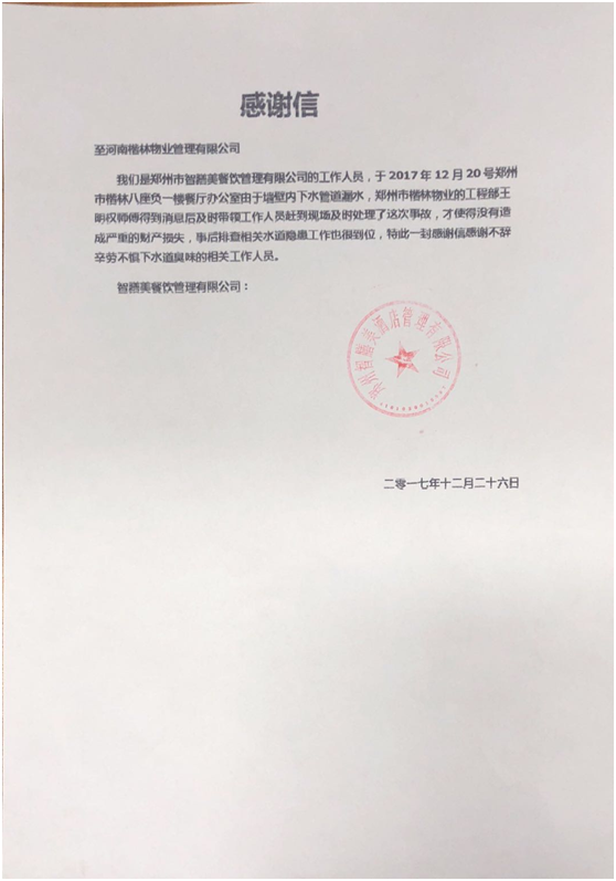 責(zé)任在心,擔(dān)當(dāng)于行,就沒有做不好的事情。價(jià)值3元的特定管道似乎微不足道,但也正印證著“把服務(wù)做到極致”楷林精神,感謝信雖不長(zhǎng),但字里行間洋溢出對(duì)楷林物業(yè)的贊賞和肯定。