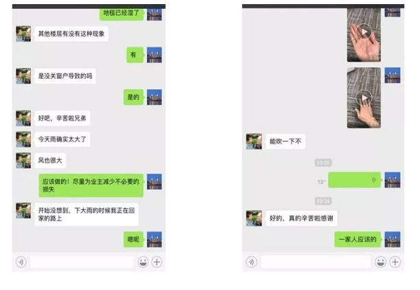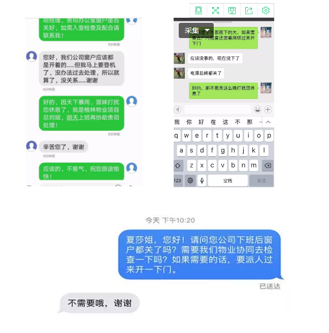 暴風(fēng)雨來襲時,很多公司早已下班,窗戶沒有進行關(guān)閉,長沙楷林物業(yè)值班經(jīng)理第一時間組織秩序,安排工程人員去每個樓層、每戶室內(nèi)進行檢查、關(guān)閉窗戶;客服部積極聯(lián)系辦公室有門禁的公司,告知客戶目前暴風(fēng)雨的危急情況,詢問窗戶是否關(guān)閉,能否告知門禁密碼或是前來送門禁卡、是否需要物業(yè)協(xié)同去戶內(nèi)進行檢查、清掃等一系列暴雨應(yīng)急措施。