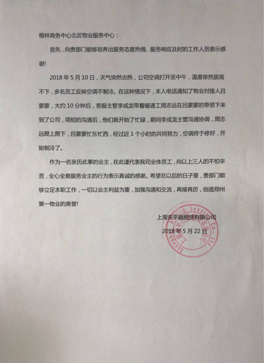 無奈之下,員工們與楷林中心北區(qū)客服取得聯(lián)系,希望能夠幫忙解決問題。正值午餐之際,在接到電話后,客服部呂萌萌、李成龍,工程部周志遠放下午飯,一同來到客戶辦公地點,短短十分鐘,溝通協(xié)調,查明問題,便開始了忙碌。拆卸風口,供應試水,絲毫不停歇,一小時后,空調恢復制冷,而三位楷林物業(yè)人的衣服已被汗水浸透。