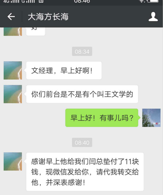 工作像往常一樣進(jìn)行,沒有因為這件小插曲而改變什么,就像每天奔波的人們,依舊匆匆忙忙。然而,一個半小時之后,楷林中心南區(qū)的客服經(jīng)理收到這位客戶的答謝短信說感謝楷林小伙子幫助解了燃眉之急,工作繁忙不便親自答謝,托人將11元錢轉(zhuǎn)交,謝謝了。