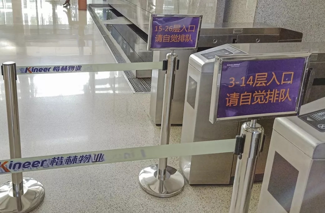 楷林國際寫字樓的門禁閘機(jī)外放置兩個(gè)一米桿進(jìn)行分流,將通道分為3部分:高區(qū)進(jìn)口、低區(qū)進(jìn)口、中間出口。同時(shí),安置插牌進(jìn)行詳細(xì)指引:提前發(fā)放溫馨提示告知客戶。