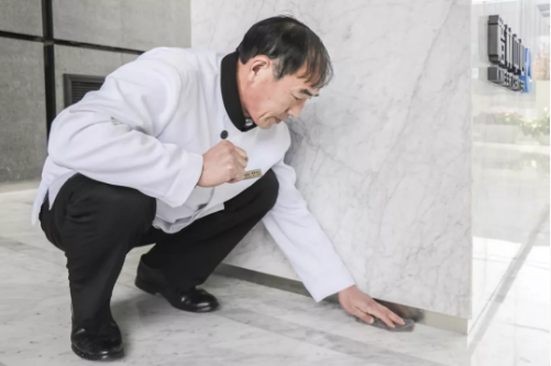 “清理時(shí)間一定要把控好。時(shí)間長(zhǎng)了,容易花;時(shí)間短了,亮度會(huì)不夠;所以我一般把時(shí)間控制在7—10分鐘。而且必須采用從前至后,從左到右的移動(dòng)順序按部就班地一塊一塊的進(jìn)行處理……”現(xiàn)如今,在郭師傅的眼里,每月一次的石材結(jié)晶養(yǎng)護(hù)已經(jīng)手到擒來。從事養(yǎng)護(hù)工作四、五年的郭師傅知道,石材結(jié)晶養(yǎng)護(hù)是非常耗時(shí)耗力,加之機(jī)器難以掌握,稍有不慎,便會(huì)碰壞周邊的物品或傷害自己,可謂是對(duì)技術(shù)要求甚高的工種。而郭師傅日復(fù)一日的堅(jiān)持這項(xiàng)工作,顯然已經(jīng)摸清了其中的“門道”。