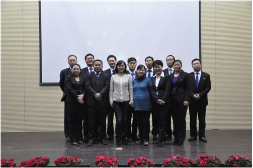 年會(huì)分為責(zé)任書簽訂和新春晚會(huì)兩部分,上午9:00各項(xiàng)目員工依次落座,總經(jīng)理李亞麗首先對2013年的工作進(jìn)行了總結(jié),指出成績的同時(shí)對我們的工作提出了進(jìn)一步的要求,希望全體員工在新的一年要在創(chuàng)新突破中實(shí)現(xiàn)跨越,之后李總與各項(xiàng)目經(jīng)理及相關(guān)部門經(jīng)理進(jìn)行了2014年目標(biāo)責(zé)任書的簽訂。董事長楊振海針對2014年工作對全體員工提出了新的期望。